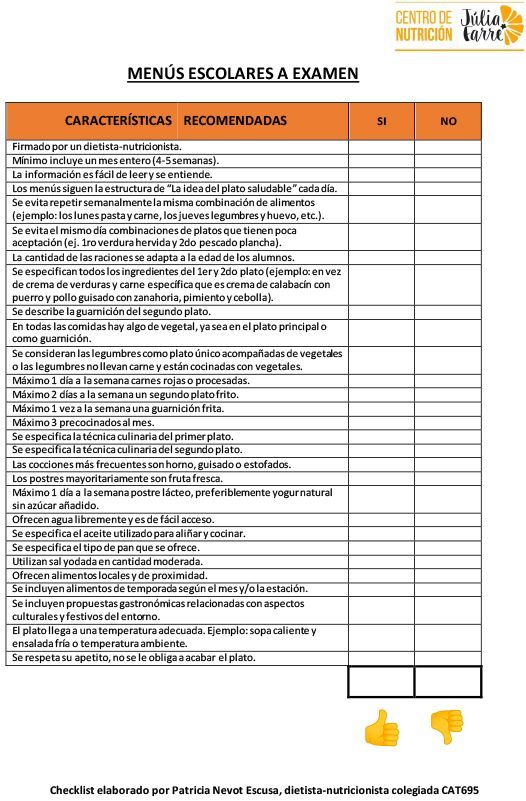 Y como último punto del apartado de menú escolar no quería dejar de haceros un resumen a modo de Checklist (¡cómo me gusta crearlos!) para que evaluéis si el menú actual del colegio de tus hij@s cumple con los requisitos mínimos establecidos por las diferentes guías que os he comentado y que encontráis en la bibliografía. Pasos a seguir: